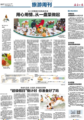 “今年国庆黄金周,得益于中秋节的叠加效应,独具特色地展现琼岛文化、民俗文化的旅游产品将受到热捧。”海口市旅行社协会副秘书长孙相涛说。