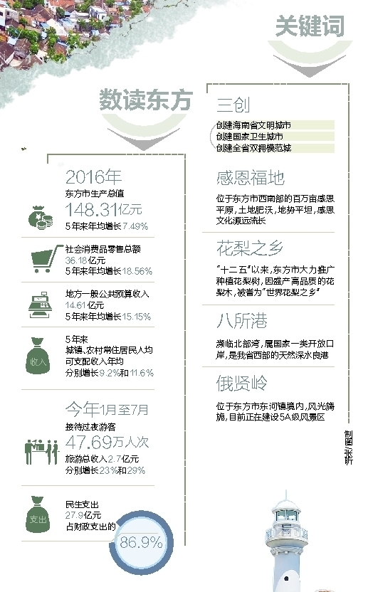 拥有百万亩感恩平原和128公里优质海岸线的东方,是我省第三大依海而建的城市。过去5年来,东方市以新发展理念为引领,全面深化供给侧结构性改革,调优做精三次产业,加快城乡基础设施建设,扎实做好农村土地确权、殡葬改革、社会治理、基层党建等基础性工作。全市生产总值从2012年的109.61亿元,增长至2016年的148.31亿元,城市规模不断扩大,经济社会实现跨越式发展。