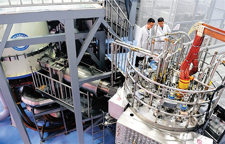 9月27日,工作人员在查看混合磁体装置现场。 当日,国家重大科技基础设施“稳态强磁场实验装置”在安徽合肥通过验收,使我国成为继美国、法国、荷兰、日本之后第五个拥有稳态强磁场的国家。据了解,目前该装置已建成3台场强创世界纪录的水冷磁体,建成场强排名全球第二的40T级混合磁体,将向45T的世界纪录发起冲击。