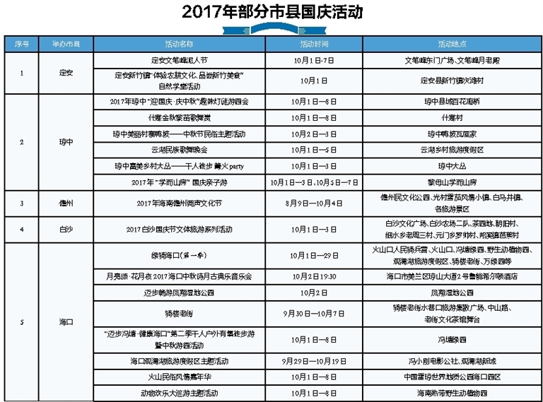 根据海南旅游信息技术有限公司汇总统计显示,今年国庆黄金周出游最高峰将出现在9月30日、10月1日、10月2日,因此,双节期间,错峰出游,寻找新的旅游热点,有助提升出游品质。海南旅游资源丰富多样,环岛滨海旅游带逐步形成,以热带海洋动植物资源为依托的自然人文景点将逐渐成为旅游热点。