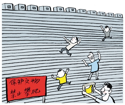 通常,城墙根多是市民休闲的好去处。修复后的正定县古城墙,墙体很高,呈阶梯状,为“好事者”攀爬提供了便利。市民攀爬古城墙,大多为了好玩、逞能,或许并没有认识到攀爬行为对古城墙的破坏性之严重。该事件再次说明,文明尤其是文物保护是需要引导的,要通过宣传让市民树立攀爬有损城墙的意识。倘若文明意识树不起来,警示牌再多也是枉然。这正是: