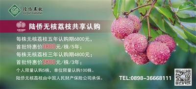 陆侨农牧公司联合中国人民财产保险公司对陆侨无核荔枝果树进行承保,全面保障客户权益。在认购期间如出现荔枝失收的情况,并且是由个别树体原因造成的,陆侨农牧公司则会从其它果树采摘补充,以达到约定的果品数量。如遇天然灾害造成全部失收的情况,陆侨农牧公司则免费为认购者延长一年合同期。另外,在认购期间,如遇雹灾、风灾、冻害、暧冬等不可抗拒的自然灾害,造成无核荔枝树死亡的,陆侨农牧则给予认购者移栽已成活的无核荔枝树,并承担移栽培植费用。