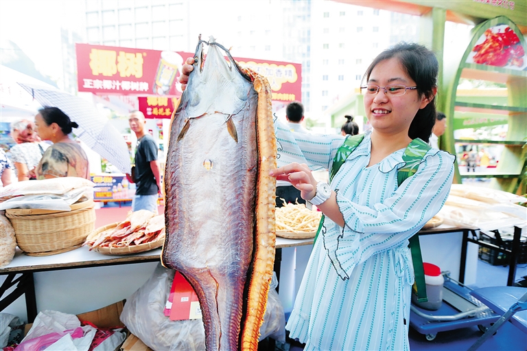 在旁边的展台上摆放着琳琅满目的饰品。记者一问才知是特色原料加工的工艺品,包括沉香、黄花梨、星月菩提、椰蒂等天然原料制成的手链及项链。记者向商家了解到,这些饰品都有特别的功效,比如沉香具有安神功效等,这成了产品的一大卖点。不少市民驻足在展台前佩戴比试,场面非常热闹。