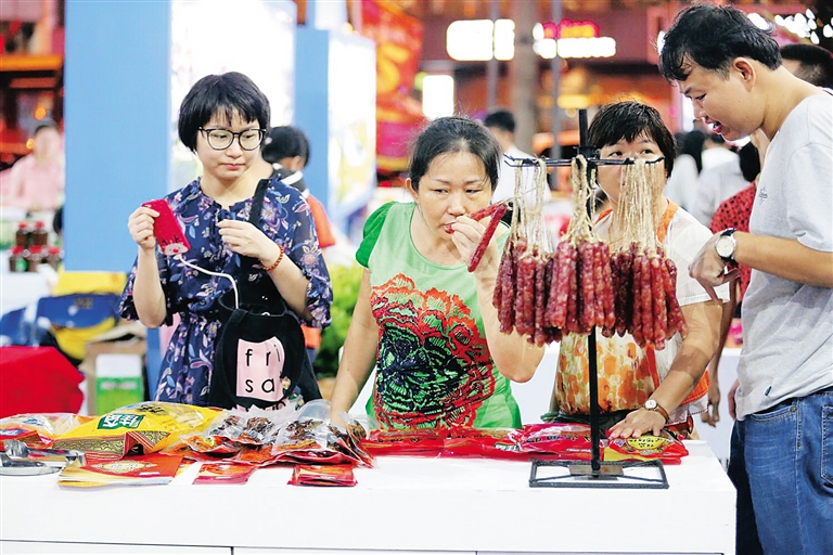 “我们这是一个与爱情有关的美食品牌……”在茶油蒸鸡的展台前,企业负责人向来往市民游客讲起了他们品牌创始人的故事。