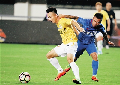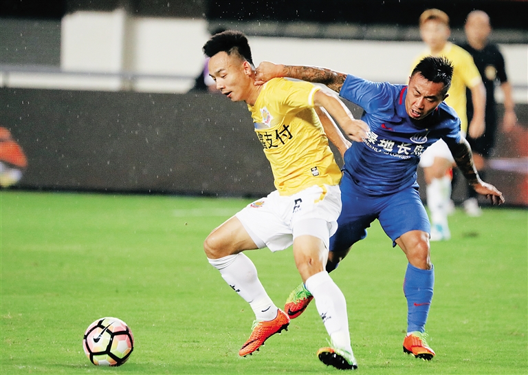 9月29日,在2017赛季足协杯半决赛次回合比赛中,上海绿地申花队客场以1:0战胜上海申鑫队,并以2:0的总比分晋级决赛。图为两队球员拼抢。新华社发