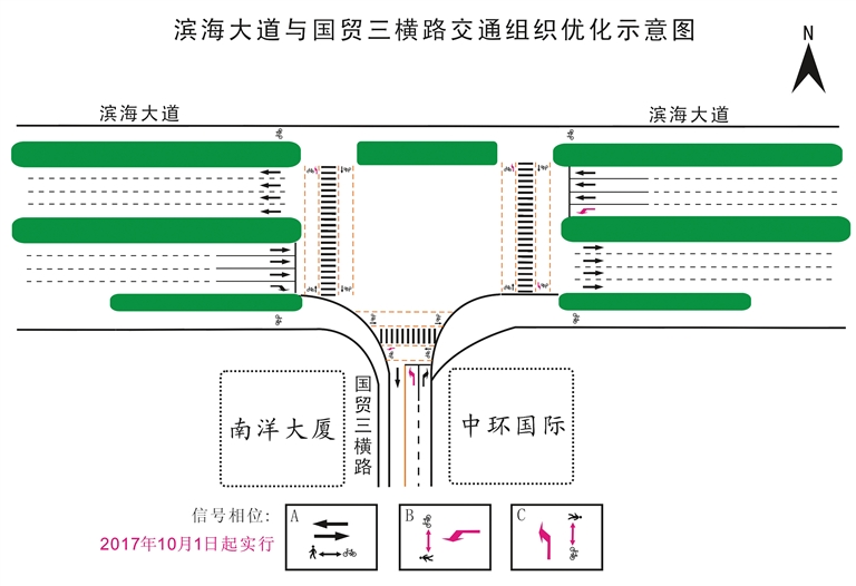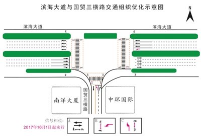 本报海口9月29日讯 (记者邓海宁 通讯员袁涛)记者今天从海口市公安局交警支队获悉,为打通国贸片区分流通道,海口市城建集团近期完成了滨海大道与国贸三横路交叉口交通组织优化改造,10月1日起,该交叉口交通信号灯启用。