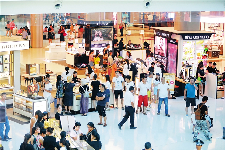 10月5日,在三亚海棠湾国际免税城,游客们正在选购免税商品,几乎每个柜台前都是一片热闹景象。本报记者 张杰 摄