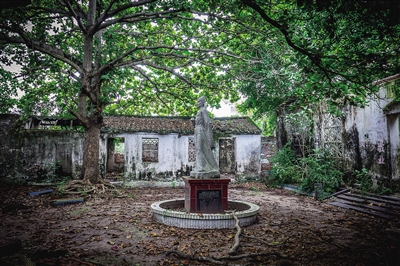 儋州古镇中和,东坡书院西面约一里处,有一所希望小学,学校内有“丽泽书院”遗迹,高大的榄仁树下,有一座明代琼山进士、海瑞学生许子伟(1555—1613)的石雕像,石像背后立着一块古碑,字迹已经模糊难辨,与破败的房屋一起,见证着岁月的无情。