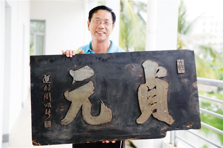 秋日午后,走进海南大学教授、海南省收藏家协会理事宋静敏的办公室,满屋的老物件散发着古旧味。专注研究海南少数民族体育运动的宋静敏出于喜爱,几十年来零零散散收藏了不少文物。他的收藏从最初的与民族体育相关的内容扩展到越来越广的领域。在他的众多收藏中,匾额是一个重要的门类。在这间不大的办公室里存放了大大小小20余块他从海南、广西等地收集而来的匾额。