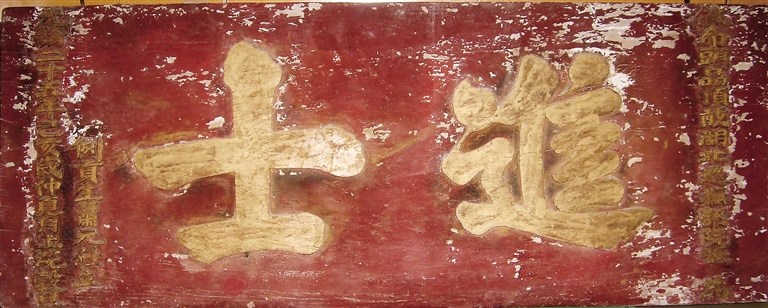岁月的打磨早已让这块题写着“福寿康宁”的匾额底色剥落成了原木色,黑色的字体也已经淡化。匾额右侧的题字磨损严重,只可依稀辨别出“□□人□□□荣寿大庆”等字样;左侧落款清晰地显示着“琼崖守备中将司令王毅题”。仔细端看“福寿康宁”四个大字没有花俏“炫技”,字体中规中矩,端庄雅正。这块长约170厘米、宽约42厘米的匾额被“横腰”锯成了上下两部分,四个大字正书写在上半截。之所以能够断定它是为人所“锯”,就是因为上下分开的断口十分整齐。