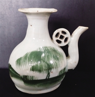喇叭口白底绿彩山水草木纹壶,大小同上,器形稍有变化。颈渐次加粗,其下溜肩微缓,壶身下部与前两者直筒不同,先渐收束,再留矮足;壶身大部画远山近水,河边垂柳如盖,枝条飘飞,树周草茂花繁,衬以卵白天青,赏心悦目;一侧行草书“山水宜人”点明主旨。其画其书非一般窑工所能为,应为佚名的爱山爱水爱画爱书爱诗爱酒之文人墨客遗留。