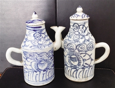 10多年来,笔者在海口东湖地摊及鼎臻、金鹿古玩城先后寻觅到50余只、现已很少见到的小酒壶了。陈展的40只多出自景德镇民窑、钦州小江窑,少数来自粤、闽地方窑。釉色涵盖青花、粉彩、红釉、蓝釉、绿釉、青白瓷等,时间跨越清代早、中、晚期及民国。惹人喜爱是因为它不像官窑稀缺昂贵、真假难辨,又比一般民用瓷精巧,且能表达普通人景仰祖先和对精致生活的渴望。
