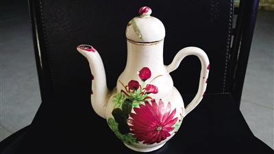 高10.8厘米、底径7.8厘米,喇叭口、短颈、溜肩、桶腹、底微凹、造型小巧、优美。白釉,壶身遍布细密开片,其身、盖面、流根部随意喷施胭脂水红釉。两侧渐浓处留白底橄榄形开窗,一侧绘红菊花、淡绿叶、墨色枝;一侧书行草“弌(一)片冰心”。书画写意、洒脱、老到。它多是海南供案上祭祀祖宗的代表性酒器,也是昔日文化人小酌的爱物。时过境迁,自然损毁,部分遗存多流落古玩市场。