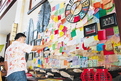 在景区随意涂鸦的行为着实让人反感。对此,儋州不是简单地一禁了之,而是尝试开设“心灵墙”供游客自由“吐槽”。记者今天在儋州森林客栈看到,这里的“心灵墙”,贴满了五颜六色的小纸片,图文并茂,全是游客们的心声。