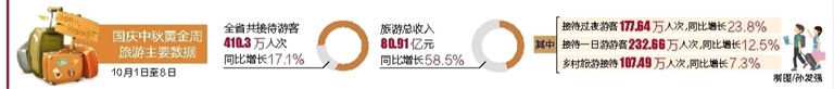 “今年是我省全域旅游创建示范省的关键之年,各市县以推进全域旅游创建工作为契机,结合国庆中秋长假游客需求,专门推出不同类别的全域旅游产品,点燃了省内外游客的出游热情,有效拉动了我省国庆中秋黄金周旅游市场消费。”省旅游委相关负责人表示。
