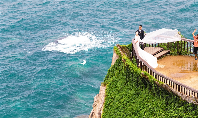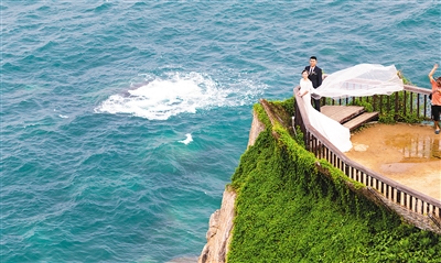 据悉,分界洲岛旅游区美丽浪漫的海岛风貌受到了不少新人的青睐。国庆黄金周期间,景区共接待200多对新人前往拍摄婚纱照,成为一道靓丽风景线。