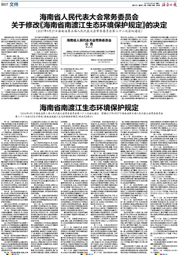 海南省人民代表大会常务委员会关于修改《海南省南渡江生态环境保护规定》的决定