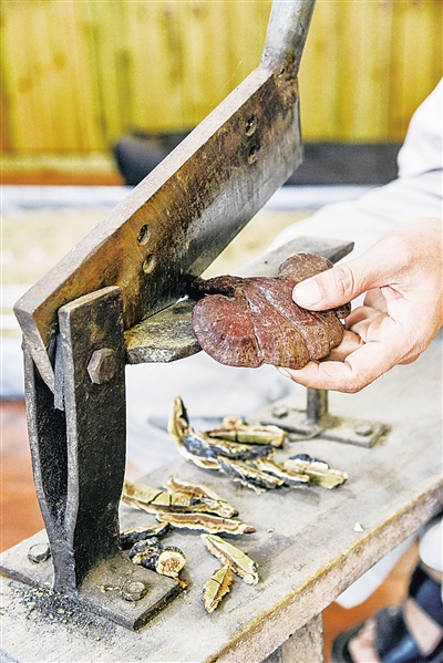 那是一个安静的午后,我们坐在很有民族风的大木椅上,喝着微苦还甘的灵芝茶,看着憨厚的店家蹲在地上挑选灵芝,在一个大砧板上奋力砍着貌似木头一样的药材,时不时回头对我们科普一下中药的知识,时不时起身招呼进店的客人,买不买没关系,他一样会盛上热腾腾的灵芝茶给人家品尝。