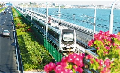 “体验式运行”的厦门地铁1号线列车行驶在集杏海堤上(10月11日摄)。 当日是厦门地铁1号线“体验式运行”的最后一天,市民争相体验厦门首条“跨海”地铁。据介绍,厦门地铁1号线全长30.3公里,共设24个站点,今年10月6日开始 “体验式运行”,计划今年年底开通试运营。 新华社记者 姜克红 摄