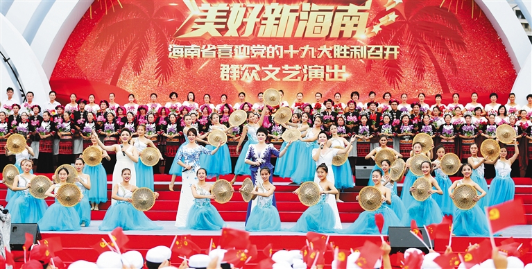 演出在歌舞表演《红旗颂》下拉开序幕,随后《万泉河水清又清》《腾飞的海南》《杨大懒脱贫》等情景歌舞、小品和合唱表演节目相继上演。演出还特别安排了红歌联唱及海南民歌联唱环节,《闪闪红星》《咱们工人有力量》《八月桂花遍地开》等一首首红歌唱出群众对过去峥嵘岁月的追忆,对党和祖国的赞颂。