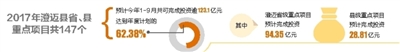 据悉,2017年澄迈县省、县重点项目共147个,预计今年1月至9月,该县省、县重点项目共可完成投资123.1亿元,达到年度计划的62.38%。其中,该县省级重点项目预计完成投资94.35亿元,达到年度计划的75.21%;县级重点项目预计完成投资28.81亿元,达到年度计划的40.04%。