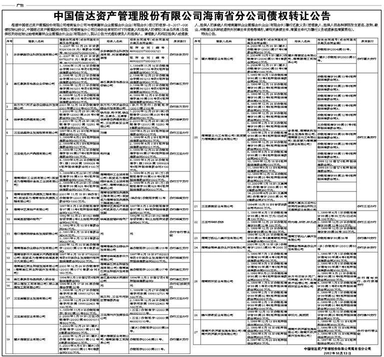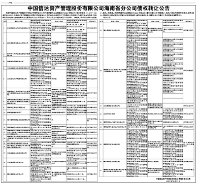 中国信达资产管理股份有限公司海南省分公司债权转让公告
