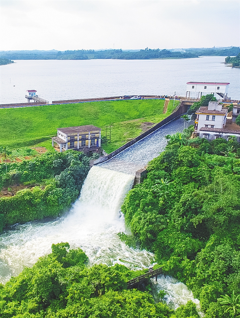 10月14日,文昌蓬莱镇石壁水库正在提前预泄,降低水位。