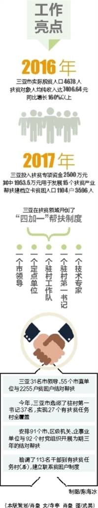 “三亚31名市领导、55个市直单位与2255户贫困户结对帮扶,并积极选派各级优秀党员干部到贫困村任第一书记,多举措壮大扶贫攻坚力量。”三亚市委常委、组织部部长傅君利说,今年,三亚市选派了驻村第一书记37名,实现27个有扶贫任务村全覆盖;安排91个市、区级机关、企事业单位与92个村党组织开展为期三年的结对帮扶;同时,还抽调了113名干部到有扶贫任务村(居),建立联系贫困户制度。