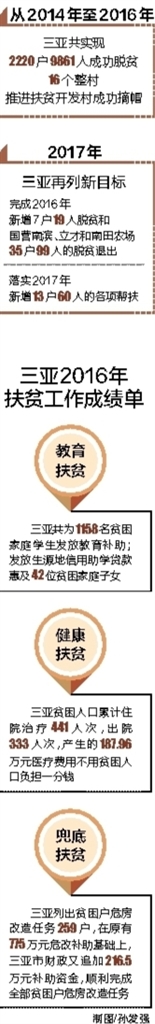 施策精准、帮扶跟进,三亚扶贫工作交出了一份满意成绩单。从2014年至2016年,三亚共实现2220户9861人成功脱贫,16个整村推进扶贫开发村成功摘帽。2017年,三亚再列新目标:完成2016年新增7户19人脱贫和国营南滨、立才和南田农场35户99人的脱贫退出;落实2017年新增13户60人的各项帮扶;同时开展“回头看”,夯实脱贫成果, 坚决打赢精准脱贫的攻坚战。
