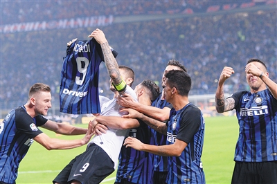 北京时间10月16日凌晨,意甲第八轮上演米兰德比,结果国际米兰主场以3:2战胜AC米兰,国米前锋伊卡尔迪上演帽子戏法。图为伊卡尔迪进球后展示9号球衣与队友庆祝。新华社发