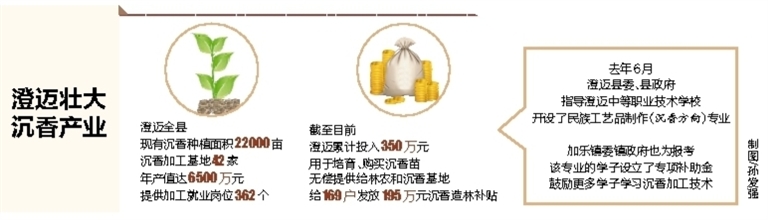 沉香作为澄迈县主要农林产品之一,得到澄迈县委、县政府的大力推广。如今,澄迈县南部地区每家每户基本都种上沉香,并逐渐形成规模。澄迈县现有沉香种植面积2.2万亩,沉香加工基地42家,年产值达6500万元,所提供加工就业岗位达362个。