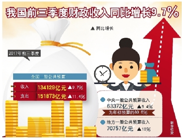 财政部数据显示,前三季度,全国财政收入同比增长9.7%,达到134129亿元。其中,中央一般公共预算收入63372亿元,同比增长9.4%;地方一般公共预算本级收入70757亿元,同比增长10%。全国一般公共预算收入中的税收收入113101亿元,同比增长12.1%;非税收入21028亿元,同比下降1.6%。
