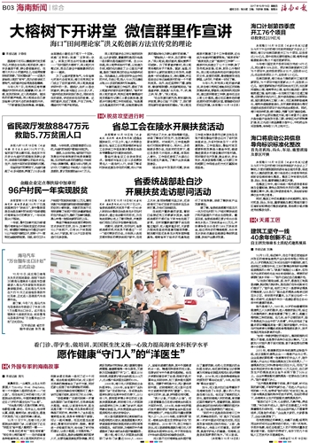 今年5月7日,在秀英区海秀镇儒益村村民休闲点,随着镇、村(居)干部、党员的到来,这儿热闹起来。随后热烈的掌声响起,洪义乾结合自己参加省第七次党代会的亲身感受开讲。