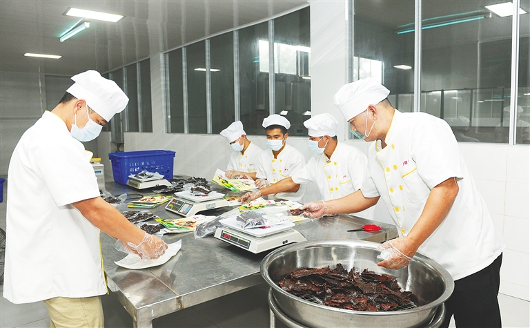 将晾晒好的牛肉干进行真空包装、杀毒,再过称装盒……10月17日下午,在澄迈县瑞溪镇华联社农产品集配中心内,数名建档立卡贫困户正在厂区的生产线上忙活着。在掌握、学习了操作技术后,他们每人每月都可获得2500元工资。