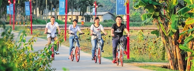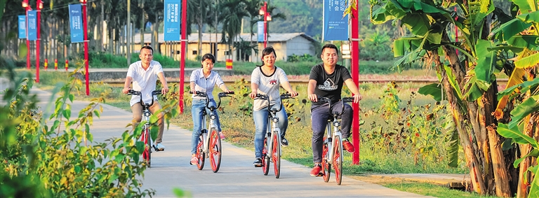 琼海市还对部分农村公路进行提升改造,进行绿化美化,建成旅游绿道,大力发展乡村旅游。塔洋镇鱼良村村民陈昌翠就在“七星伴月”乡村景区旁经营了一家水果驿站,这段时间正迎来旅游旺季,每天忙得不亦乐乎,“党的十九大召开了,报告里提了那么多民生福利,相信我们的日子以后会越来越好。”