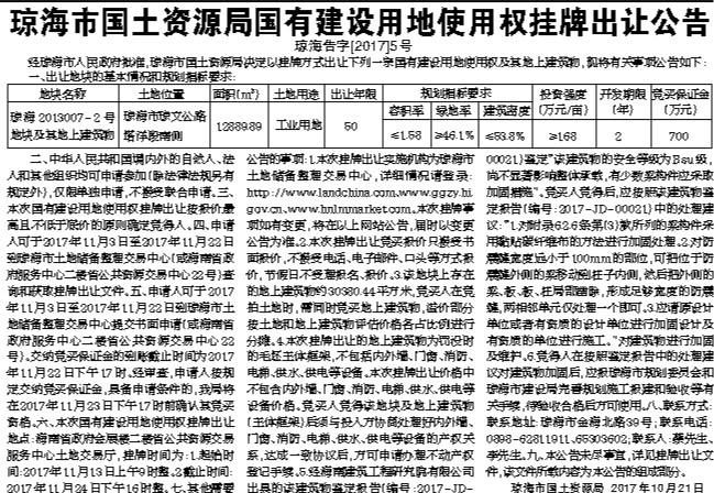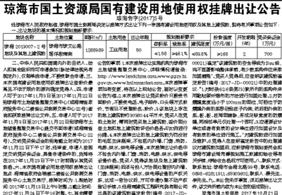 琼海市国土资源局国有建设用地使用权挂牌出让公告
