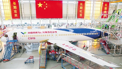 C919大型客机102架机停放在中国商飞公司上海飞机制造有限公司总装车间内。日前,C919大型客机102架机已完成整机喷漆工作,目前正在进行发动机安装调试。新华社发