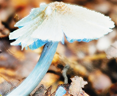 这是蓝色蘑菇新种“勐宋粉褶菌”。中科院团队在云南发现一蓝色蘑菇新种,命名为“勐宋粉褶菌”,这一研究成果发表在国际期刊《土耳其植物学杂志》上。 新华社发