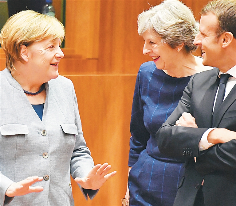 10月19日,在比利时布鲁塞尔,德国总理默克尔(左)和英国首相特雷莎·梅(中)、法国总统马克龙在欧盟秋季峰会会场交谈。 为期2天的欧盟秋季峰会19日开始在比利时布鲁塞尔举行。 新华社/美联