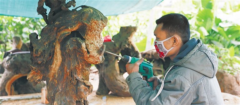 正是在胡信连等最早一批根雕业者的影响下,自上个世纪八九十年代以来,南桥镇逐渐掀起根雕艺术风,当地不少原本务农的农民也开始拜师学艺当起了根雕师傅。“三分刀工七分天然”……近年来,南桥镇根雕工艺越来越精湛。据南桥镇镇长罗青洪介绍,为了有效整合资源,扶持根雕这一特色产业,自2015年起,万宁市在南桥镇建设根雕文化艺术长廊,引进当地29家根雕艺术馆进驻,将零散的分布个体户串联起来,同时建成根雕示范点,借此提升根雕产业影响力。