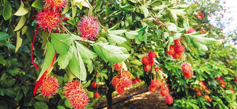 在这个季节,你可邀上几位好友,或带上孩子,一起到红毛丹果园采摘,触摸果树上红色小刺猬一样的果实,别有一番乐趣;可以在挂满果实的红毛丹树下留影,也可边摘边吃,剥开柔软的毛刺品尝果实,满口清甜,吃完还可以打包几箱回去送亲朋好友。