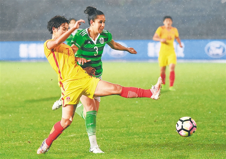 10月21日,在2017年中国足协永川国际女足邀请赛中,中国队以3:2战胜墨西哥队。图为中国球员王霜(左)在禁区内抢点射门。 新华社发