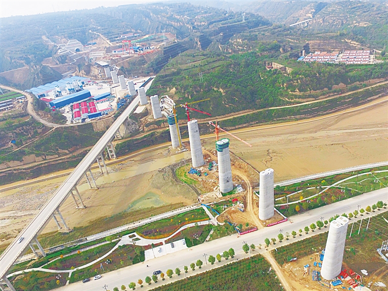 中国铁建二十二局集团承建的银西高铁马莲河特大桥下部工程基本完工,正转入上部梁体作业(10月21日摄)。 银川至西安高速铁路是国家高速铁路网的重要组成部分,线路全长约617公里,设计时速250公里。高铁全线通车后,从银川至西安车程将由目前的12小时缩短至3小时左右。目前该项目线下工程基本完工,预计2020年建成通车。 新华社发