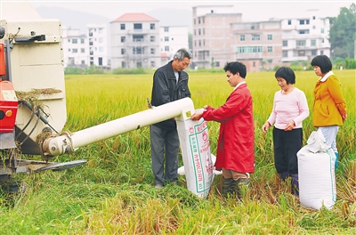 10月22日,在江西省于都县梓山镇安和村,当地农户在稻田里将水稻打包装袋。近日,江西省于都县梓山镇安和村农户趁着有利天气及时收割晚稻。新华社记者 彭昭之 摄