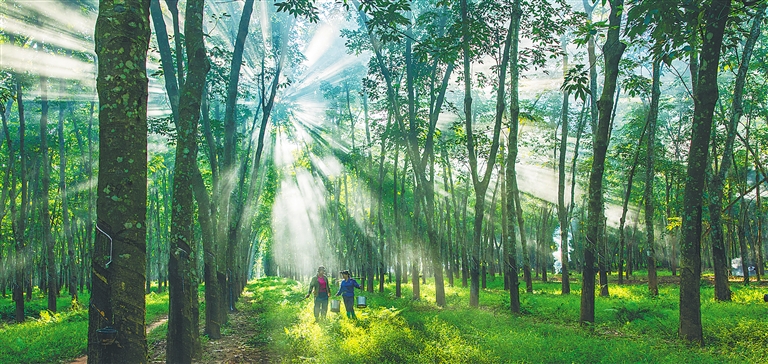 海胶集团龙江分公司是国家标准化示范胶园建设单位之一,建设总面积达17万亩。图为该分公司茶山8队胶园胶工割胶归来。通讯员 许欢 摄