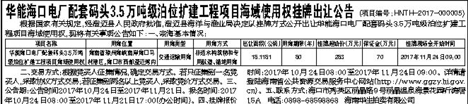 华能海口电厂配套码头3.5万吨级泊位扩建工程项目海域使用权挂牌出让公告