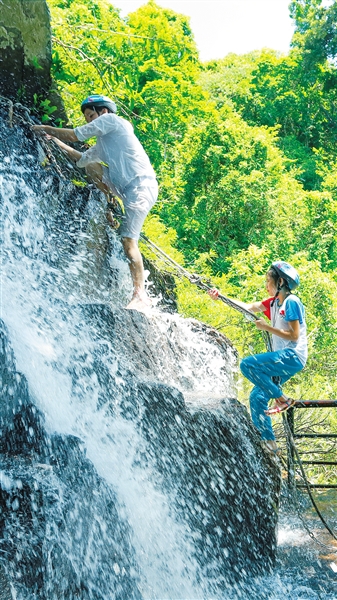 在景区梦幻谷,戏水教练带着一批又一批游客踏入泉瀑中,挑战“踏瀑戏水”刺激的八大关卡。雨林舒适的气温让游客在戏水中“越战越勇”,谷中欢笑声不绝于耳,热闹非凡。