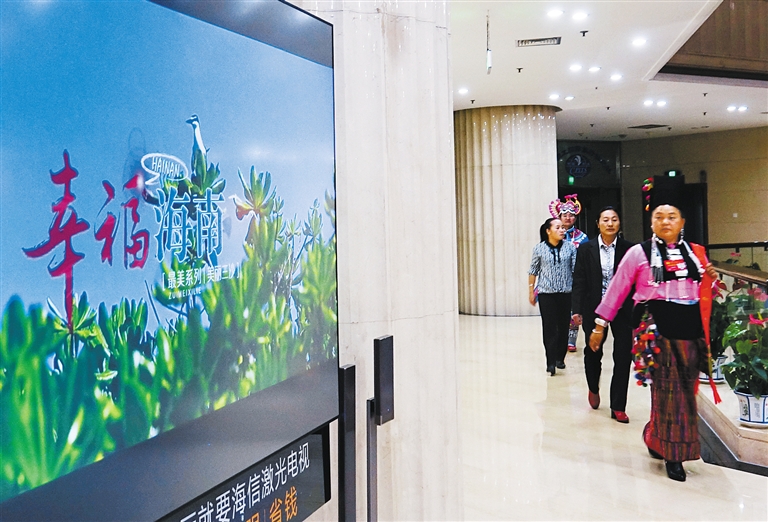 10月23日,党的十九大代表驻地之一——北京中国职工之家饭店的主要通道上循环播放着海南宣传片,成为展示海南之美的窗口。本报特派记者 李英挺 摄