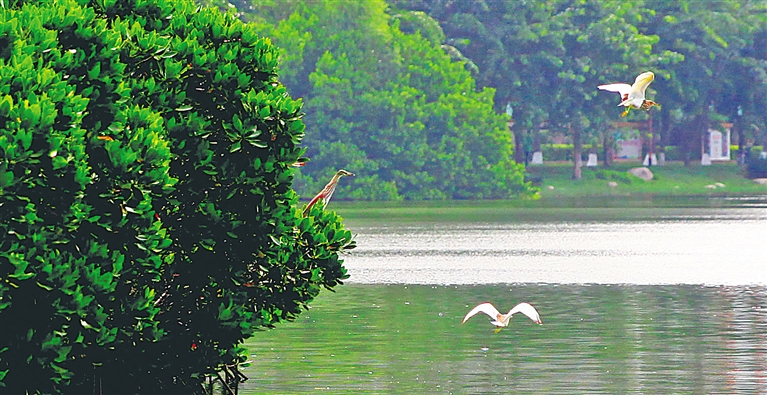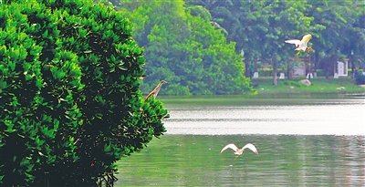 入秋以来,在海南大学东坡湖畔,长势良好的红树林每天吸引不少鹭鸟飞来栖息、觅食。据了解,海南大学东坡湖红树林共有海桑、红海榄、木榄、海莲、尖瓣海莲、无瓣海莲等数十种树种,每年吸引大量候鸟在此栖息繁殖。