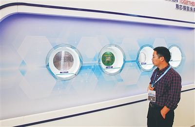 10月25日,参观者在观看一个由纳米光罩和晶圆凸块等芯片制造材料组成的展示墙。 当日,第90届中国电子展在上海新国际博览中心举行。1300家展商将在本届展会上集中展示集成电路、电子元器件、智能制造、智能硬件等电子信息产业领域内的最新技术和成果。